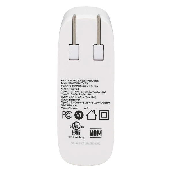 The Tripp Lite U280-W04-100C2G is a high-performance compact USB wall charger engineered for multi-device charging with maximum efficiency and intelligent power management. Designed with advanced GaN (Gallium Nitride) semiconductor technology, this unit delivers exceptional power density and thermal performance in a small form factor, making it ideal for professional, travel, and everyday use.