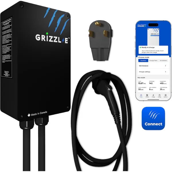 Smart Connect features (Wi-Fi) — scheduling, remote start/stop, usage monitoring and remote firmware updates via the Grizzl-E Connect platform.
