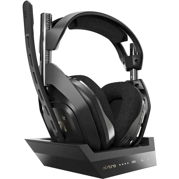 The ASTRO Gaming A50 Wireless Gaming Headset. Designed for use with Windows and Mac computers or the PS4 and PS5 consoles, it features 40mm drivers tuned with ASTRO Audio V2 to deliver clear, detailed sound at wide frequencies and volume levels. It can decode Dolby Atmos audio when used with your console or Windows computer and is equipped with a unidirectional boom microphone that can be muted by simply flipping it up. The A50 has a 30' wireless range from the included base station and has up to a 15-hour battery life.