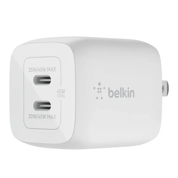 The Belkin 45W Dual USB-C Wall Charger Fast Charging Power Delivery 3.0 w/ GaN Technology for iPad, iPad Pro, MacBook, Galaxy S23, & More - White price in Saudi Arabia is AED 49.00 (incl. VAT) - Updated November 2025