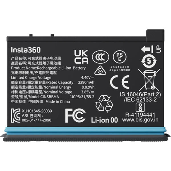 The Insta360 Rechargeable 2290mAh Battery, designed specifically for the Insta360 X4 360° Action Camera. This high-capacity battery ensures you never miss a moment, providing extended recording time and reliable performance.