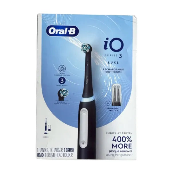The Oral-B iO Series 3 Luxe Rechargeable Electric Toothbrush, a state-of-the-art device engineered to deliver exceptional cleaning performance. Leveraging advanced micro-vibration technology and a dentist-inspired round brush head, this toothbrush is clinically proven to remove up to 400% more plaque along the gumline compared to a standard manual toothbrush. Its innovative features, including a smart pressure sensor and customizable brushing modes, ensure a personalized and effective brushing experience, making it an ideal choice for those committed to optimal oral health.